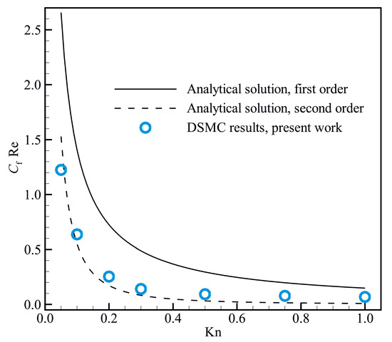 where, and are the average density and the average velocity magnitude respectively. The skin friction coefficients obtained from the present DSMC simulations for isothermal steady micro- and nanoscale flows are compared with those approximated using the analytical slip models in Figure 2, indicating the validity of the present DSMC results. According to the Cercignani’s model, the Poiseuille number () can be approximated using the first- and second-order slip coefficients as follows respectively [58]: