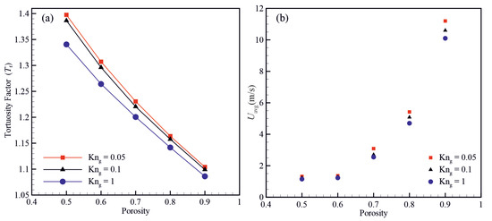 Variation of (a) the hydraulic tortuosity factor () and (b) average velocity as a function of material porosity and Knudsen number.