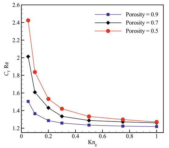 Figure 7 shows the variations of the Poiseuille number () for different material porosities and Knudsen numbers. The results indicate that the Poiseuille number increases with decreasing the material porosity at a specific Knudsen number. The Poiseuille number seems to be more sensitive to variations of the Knudsen number at low material porosity, which can be attributed to the enhancement of the collisions between gas molecules and solid boundaries at low material porosities. The Poiseuille number decreases with increasing the Knudsen number for all the material porosities studied in the present work; however, it seems that the decrease in the Poiseuille number becomes negligible for Knudsen numbers () larger than 0.5.