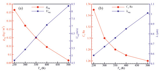 Figure 8 shows the effect of solid wall temperature on the gas density, average fluid velocity, Poiseuille number and molecular mean free path. The density of the gas and the Poiseuille number decrease with increasing the wall temperature. Moreover, the molecular mean free path and average fluid velocity increase with increasing the solid wall temperature.