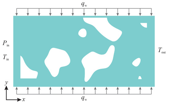 Heat and fluid flow in a super nanoporous material subject to constant wall heat-flux boundary conditions is described in this section. The material has a porosity of and a constant wall heat-flux boundary condition is imposed on its top and bottom surfaces, as shown in Figure 9.