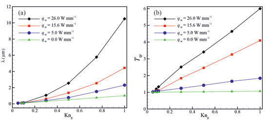 Variation of (a) the molecular mean free path and (b) mean bulk gas temperature as a function of Knudsen number for different wall heat fluxes.