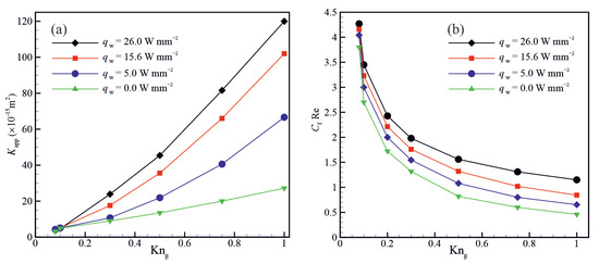 Figure 12 shows the variation of the apparent permeability () and Poiseuille number () as a function of Knudsen number for different wall heat fluxes. The results shown in Figure 12a indicates that the apparent permeability increases with an increase in the wall heat flux. This increase in the apparent permeability can be attributed to the enhancement of the molecular mean free path and hence the rarefaction effects. Figure 12b indicates that the Poiseuille number decreases with increasing the Knudsen number and increases with increasing the wall heat flux. This is because the gas viscosity decreases with increasing the gas bulk temperature and Kundsen number.