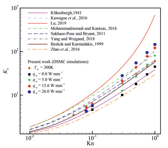 Various models are proposed in the literature to approximate the value of apparent to intrinsic permeability ratio for rarefied gas flows, as summarised in Table 1. To the best of the authors’ knowledge, there is no reliable experimental data in the literature reporting gas flow in super nanoporous materials. In such situations, a common practice is to use analytical models and previous numerical data to assess the validity of a computational model. The permeability ratios obtained from the present DSMC simulations are compared with the models presented in Table 1, and the results are shown in Figure 13. The present DSMC results are obtained for argon flow through a porous material with a porosity of and an inlet-to-outlet pressure ratio () of 2. It seems that the present DSMC results obtained using a constant wall temperature boundary condition agree reasonably with the model proposed by Kawagoe et al. [51] for a wide range of Knudsen numbers varying between and 1. However, the model of Kawagoe et al. [51] fails to approximate the value of the permeability ratio when a constant heat flux is applied on the outer boundaries of the porous material. When an adiabatic wall boundary condition (i.e., ) is used, the DSMC results seem to agree with the model proposed by Klinkenberg [21]. However, it appears that none of the models can approximate the value of the permeability ratio with reasonable accuracy when a finite heat flux is applied to the outer boundaries of the porous material.