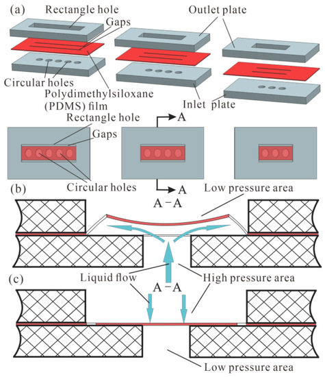 The check valve unit used in this paper is presented in Figure 1a, which was made of a thin PDMS flexible film sandwiched between an inlet plate and an outlet plate. Several circular holes were engraved on the center line of the inlet plate, a rectangular hole larger than the area of the circular holes was engraved on the center of the outlet plate, and two narrow gaps were cut on the PDMS film along the long edges of the rectangular hole, constructing a bridge valve with two fixed ends. When the pressure at the inlet plate side was higher, liquid flow from the circular holes could push the bridge valve to bend and flow through the rectangle hole to the outlet plate side, as shown in Figure 1b. Otherwise, when the pressure at the outlet plate side was higher, liquid flow from the rectangle hole would push the bridge valve to cover the circular holes and the liquid flow was blocked by the valve from flowing back to the inlet plate side, as shown in Figure 1c.