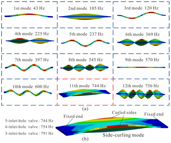 (a) The first 12 wet modes of the five-inlet-hole polydimethylsiloxane (PDMS) valve; (b) enlarged diagram of the side-curling mode.