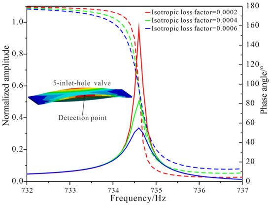 The frequency responses of the five-inlet-hole PDMS valve were evaluated using harmonic analyses. In the simulation, liquid water was not modeled for simplification, which led the side-curling mode frequency to be 734.6 Hz; instead, a pressure of 0.1 Pa was applied on the surface of the valve with a frequency range from 732 Hz to 737 Hz in steps of 0.1 Hz, and an isotropic loss factor was employed to simulate the damping effect of liquid water. The frequency responses of normalized amplitude along the vertical direction and phase angle between the vibration of the valve and the driving force were obtained as shown in Figure 3. It can be seen that when the exciting frequency was 734.6 Hz, the amplitude of the valve reached the peak value, at which the phase angle was around 90°; when the exciting frequency was lower than 734.6 Hz, the phase angle was close to 180°; when the exciting frequency was higher than 734.6 Hz, the phase angle was close to 0°; and the larger the damping, the smaller the amplitude peak, and the smoother the phase angle transition from 180° to 0°.