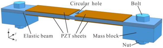 An elastic beam (100 mm × 15 mm × 2 mm) was machined with three circular holes, one in the center and two near both ends. Four PZT-4 piezoelectric sheets (30 mm× 15 mm × 0.2 mm) were adhered to the elastic beam on the surfaces between the three holes using a high-strength epoxy resin glue (DP460). Stainless steel square gaskets were used as mass blocks and bolted to the elastic beam through the two circular holes near both ends.