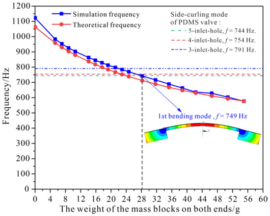 In addition, modal simulations were conducted in ANSYS 18.0 to obtain the relationship between the first bending resonant frequency of the resonator and the weight of the mass blocks. Both the simulation and theoretical results revealed that the resonant frequency decreased approximately inversely with the square root of the weight of the mass blocks, as shown in Figure 6. The tuning range of the first bending resonant frequency was 577~1063 Hz, theoretically, and 577~1123 Hz, in simulation, with the mass blocks’ weight of 0~56 g, which ensured that the resonant frequency of the resonator could be tuned to match with the optimal operating frequencies of the five-, four- and three-inlet-hole valves discussed in Section 2.1.