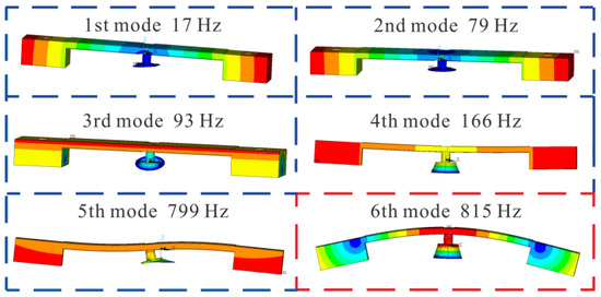 To evaluate the actual actuating state, the pump chamber diaphragm was attached to the center of the piezoelectric resonator through a linker. A modal simulation in ANSYS was executed with a fixed constraint applied on the circumference of the diaphragm and the mass blocks’ weight of 28.2 g. The first bending resonant mode of the piezoelectric resonator appeared as the 6th vibration mode when actuating the pump chamber diaphragm, as shown in Figure 7, and the resonant frequency of 815 Hz was slightly higher than that of 749 Hz (in Figure 6) under a free vibration with the same mass blocks.