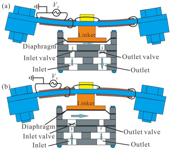 The working principle of the piezoelectric pump is presented in Figure 9, which can be generally divided into the dispensing mode (Figure 9a) and absorbing mode (Figure 9b). When the resonator pushes the chamber diaphragm to reduce the chamber volume, the pressure inside the chamber rises. As a result, the inlet valve closes, the outlet valve opens, and the liquid is squeezed out of the pump chamber through the outlet valve (Figure 9a). Alternately, when the resonator pulls the chamber diaphragm to increase the chamber volume, the pressure inside the chamber drops. Consequently, the inlet valve opens, the outlet valve closes, and the liquid is sucked into the pump chamber through the inlet valve (Figure 9b). The dispensing and absorbing modes repeat in turn with the vibration of the resonator, and liquid can be transported from the inlet to the outlet continuously.