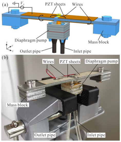 (a) Mechanical structure and (b) a prototype of the proposed piezoelectric pump.