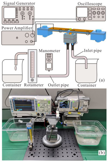 The experimental setup shown in Figure 11 was used to study the characteristics of the designed piezoelectric pump, and tap water was used as the working liquid to carry out all experiments at an average room temperature of about 25 °C. Low voltage sinusoidal signals were generated by a function generator (DG1022, RIGOL, Beijing, China), and amplified by a power amplifier (PA94, Apex Microtechnology, Tucson, AZ, USA) to drive the four piezoelectric sheets simultaneously. The amplitude and frequency of the driving voltage was monitored by a digital oscilloscope (DS1202Z-E, RIGOL, Beijing, China). The flowrate of the piezoelectric pump was measured by a glass rotameter, and the pressure was monitored by a digital manometer. Two types of square gaskets with the weights of 1.8 g and 2.7 g were selected to adjust the weight of the mass blocks.