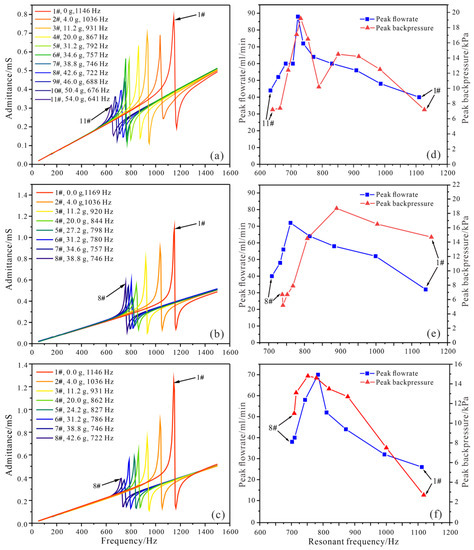 Frequency responses of admittances under different mass blocks of the piezoelectric pump using check valves with (a) 5 inlet holes, (b) 4 inlet holes, and (c) 3 inlet holes; relationships between the peak flowrate and backpressure with resonant frequency of the piezoelectric pump using check valves with (d) 5 inlet holes, (e) 4 inlet holes, and (f) 3 inlet holes.