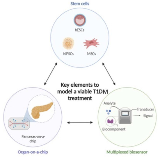 The physiological regulation of glucose metabolism in the human body is a feedback loop based on endocrine signaling between pancreas, liver, and glucose-consuming tissues. The signaling is assured by pancreatic hormones (insulin and glucagon) that are released into the blood stream. Endocrine cells are clustered together, thereby forming the so-called islets of Langerhans, which are small, island-like structures within the exocrine pancreatic tissue [4]. There are five cell types releasing different hormones: α-cells (producing glucagon); β-cells (insulin and C-peptide); γ-cells (pancreatic polypeptide; now known as pancreatic polypeptide cells (PP cells)); δ-cells (somatostatin) and ε-cells (ghrelin). Through these hormones, particularly glucagon and insulin, the pancreas maintains blood glucose levels within a very narrow range of 4–6 mM [4]. When the level of blood glucose rises, after food intake for example, pancreatic β-cells are stimulated to produce and release insulin which mediates the uptake of glucose, fatty acids, and amino acids in insulin-sensitive tissues. On the other hand, during sleep or in between meals, when blood glucose levels are low, glucagon is released from α-cells to promote hepatic glycogenolysis. The reduction of β-cell insulin production or defective responses to insulin in tissues are common characteristics of DM disorders and result in high blood glucose levels, termed hyperglycemia. In T1DM, insulin injections remain the “one-size-fits-all” treatment, but this option is not very effective and many patients (mainly children and adolescents) face severe complications. Research in T1DM continues to improve our understanding of this condition, allowing the development of novel prevention, diagnosis, and treatment options. Nonetheless, T1DM patients are highly heterogenous, with the disease arising from different etiologies, varied genetic backgrounds, and symptomatic at distinct stages and with different severities. Altogether, these suggest T1DM to be a condition best monitored and controlled via personalized medicine approaches. Moreover, our understanding of early onset of diabetes, its stratification, role of genetics, and environment (epigenetics) still requires improved research to enable pre-clinical detection and the most effective therapeutic options per patient. In this case, organoid, organ-on-a-chip, and stem cell research hold great promise and encompass novel approaches that can offer great advances and hopes for understanding and treating T1DM and associated disorders. This review explores T1DM with a particular focus on the emerging opportunities and challenges arising from new technologies in the fields of stem cell research and microphysiological in vitro models with the aim of developing personalized viable models for T1DM pre-clinical detection and management.