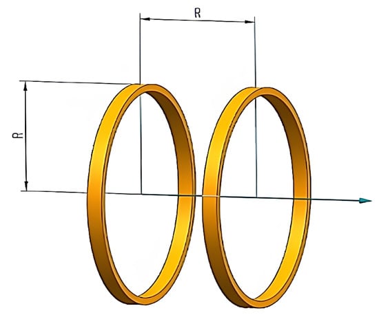 Helmholtz coils consist of a pair of circular single coils with the same number of turns, radius, and winding thickness, which are coaxially placed in parallel [,], which can produce a more uniform magnetic field near the midpoint of the axis of the two coils, and the left and right coils are connected in series with the same input current, which will produce a large range of a uniform magnetic field in its center and can be superimposed in space. The uniform magnetic field area will vary proportionally with the radius, so it is often used as a magnetic field generator. The standard Helmholtz coil structure is shown in Figure 1.