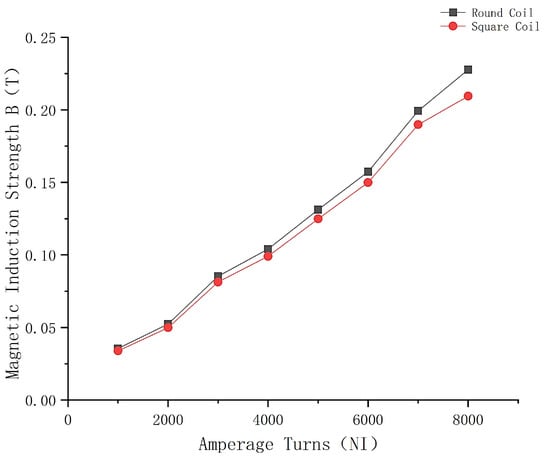 The magnitude of the central magnetic induction of the square coil and the circular coil is observed by simulation under the condition of the same number of ampere-turns, and the cloud plot of the central magnetic induction of the two coils is shown in Figure 3. The comparison graph of the central magnetic induction curves of the two coils is shown in Figure 4.