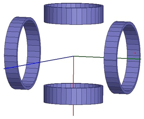 - The distance between the auxiliary coils is set to 80 mm and placed symmetrically on the left and right sides of the main coils. The simplified 3D modeling of the designed magnetic field drive coils in Maxwell software is shown in Figure 5.