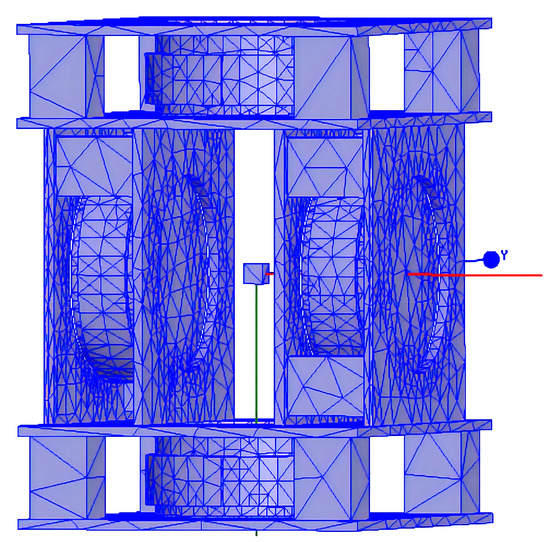 The side length of the main coil fixing plate for fixing is 150 mm × 150 mm, and the thickness is 5 mm. In order to facilitate simulation calculations and reduce the simulation time, the simplified model needs to be drawn in the software. After the simplified model is drawn, it needs to be meshed. Maxwell 3D can automatically divide the mesh according to the model, so there is no need to set the parameters separately. The mesh division diagram is shown in Figure 7.
