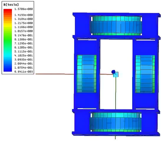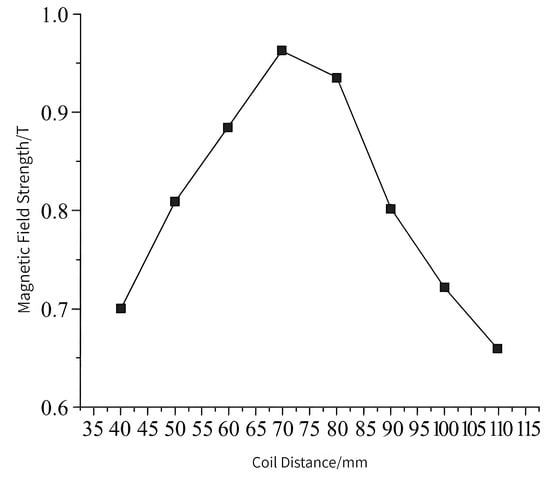 In the magnetization drive coil, the distance between the auxiliary coils is inversely related to the central magnetic induction intensity, i.e., the further the distance between the auxiliary coils, the smaller the central magnetic induction intensity, but when the distance between the two coils is too small, it interferes with the magnetic field generated by the main coil itself. Therefore, it is necessary to optimize the parameter of the distance of the auxiliary coil. The distance of the auxiliary coil is 40–110 mm, and the number of turns is 6000. When the distance of the auxiliary coil is 70 mm, the cloud diagram of the central magnetic induction is shown in Figure 8, and the variation in the central magnetic induction with the distance of the auxiliary coil is shown in Figure 9.