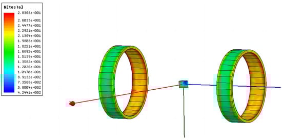 Using Equation (1), the magnetic field at any point on the axis between the two coils can be calculated. When , the magnetic induction at the midpoint of the two coils on the axis is shown in Equation (2):