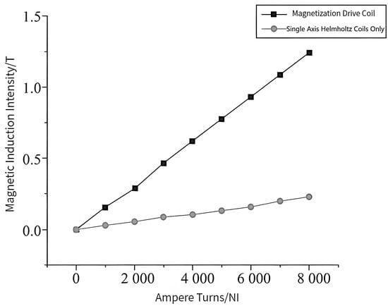 Comparison of the magnetic induction intensity characteristic curves of magnetized drive coils and Single-Axis Helmholtz Coils Only.