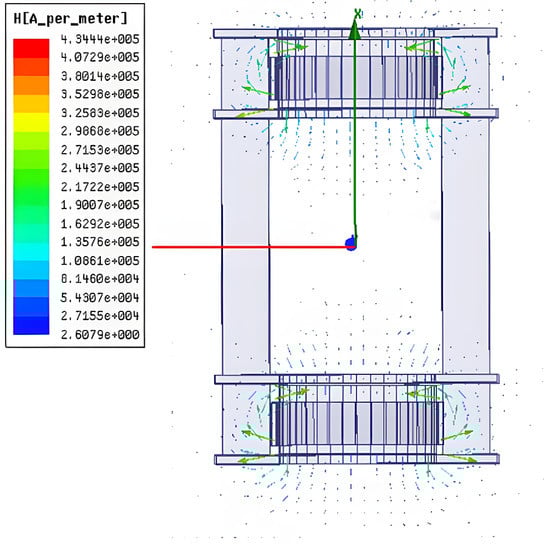 According to the design requirements, the central magnetic induction strength of the magnetization drive coil needs to be higher than 1.2 T. After selecting the optimal auxiliary coil distance, the simulation of the number of turns is also required to analyze its effect on the central magnetic induction strength of the magnetization drive coil and select the optimal parameters. The magnetic induction intensity clouds of the Helmholtz coil and magnetization drive coil are shown in Figure 10 and Figure 11. A comparison of the magnetic induction intensity characteristic curves generated at the midpoint of the center axis of the magnetized drive coil and the Single-Axis Helmholtz Coils Only is shown in Figure 12.