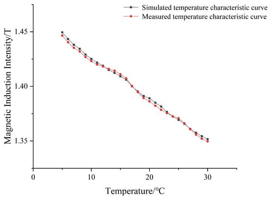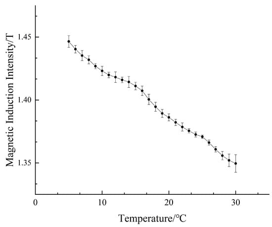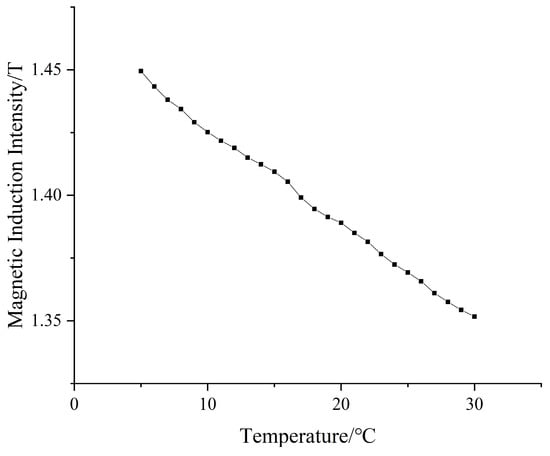 The temperature characteristic curve shows that the central magnetic induction strength decreases with the increase in the operating temperature. In this paper, the working temperature set in the simulation software Maxwell is 25 °C, that is, the magnetization drive coil is designed and optimized under the condition of a working temperature of 25 °C. In actual operation, the magnetization drive coil will be placed to work under the condition of room temperature (23–25 °C), and it can be seen from the temperature characteristic curve that the central magnetic induction intensity is greater than 1.355 T when the temperature is lower than 30 °C, which meets the experimental conditions.