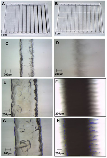 Chips and measurements. An array of flow channels was 3D-printed in wax, with matching reference channels in black resin (A) and wax (B), all encapsulated in transparent resin. All channels had a square cross-section with swept lateral dimension. The three wax/wax chips (one shown in (B) were put through the channel clearance procedure, while the reference chip (A) was not. The results were imaged in the respective pairs (C) (cleared flow) and (D) (black resin) with planned width 192 µm; (E) (cleared flow) and (F) (black resin) with planned width of 992 µm). The images were uploaded in AutoCAD and framed with polylines (G) (cleared flow) and (H) (black resin) with planned width of 992 µm). The respective framed areas were calculated through an AutoCAD function. The area ratio in each pair of images was used in the calculation of the clearance percentage.