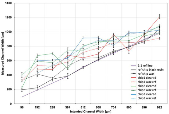 In Figure 2, the solid black scatter line and its error bars line up with the 1:1 purple line, suggesting high fidelity of printing of black resin channels, except for the smallest dimensions, where the printed channels were wider than intended. On the other hand, the wax channels were generally printed wider than intended at all dimensions (with small exceptions), so the printing accuracy is low. This is observed consistently for all wax channels, cleared and uncleared, with the largest deviation from the 1:1 happening at the smallest dimensions. The general behavior is the same regardless of which chip the data comes from, suggesting persistent effect and high reproducibility chip-to-chip.