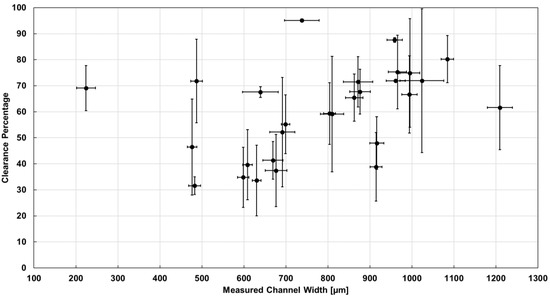 To calculate the clearance percentage, the ratio of cleared and black areas was then adjusted by a factor equal to the average measured black reference channel width divided by the average measured cleared channel width, for the same intended width. This was done to cancel out the influence of potentially unequal fidelity in printing wax and black resin channels. Standard error propagation was applied to calculate the uncertainties on the clearance percentage. The results were plotted in Figure 3, where each datapoint represents the clearance percentage of a particular channel, plotted versus the average measured width of the same channel. Because Figure 2 suggested high reproducibility of the results across wax channels in multiple chips, all data in Figure 3 was binned together regardless of which chip it came from.