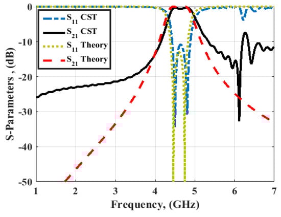 Figure 2 illustrates the S-parameters outcomes from the optimization technique (theory) and CST simulation of the BPF (Filter 1). The filter operated at 4.6 GHz central frequency, 0.41 GHz bandwidth, and −12 dB reflection coefficients. In addition, the simulated and the theoretical outcomes had the same trend.