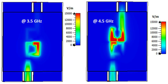 The electric field outcomes of filter 2 at 3.5 and 4.6 GHz are illustrated in Figure 4. As illustrated in Figure 3, the filter had a band stop operation at 3.5 GHz and passed the band operation at 4.5 GHz. Thus, the electric field was not transferred from port 1 to port 2 at 3.5 GHz; however, it was transferred at 4.5 GHz as illustrated in Figure 4. In addition, the electric field had a maximum level around the resonator’s gap at 4.5 GHz. Thus, by inserting four varactor diodes vertically near the gaps of the resonators as illustrated in Figure 5, the filter center frequency could be changed and controlled. Figure 6 shows the S-parameter outcomes at different values of the capacitance. The filter center frequency was moved from 4.6 GHz without capacitance to 4.1 GHz with 0.1 pF and to 3.5 GHz with 0.3 pF, respectively. The energy stored in the resonators was increased when inserting varactor diodes because they enhanced the resonator quality factor, and then the achieved bandwidth was reduced as shown in Figure 6. Therefore, the varactor diode’s capacitance could decrease the filter center frequency, but at the expense of its bandwidth and optimization should be done to extract the desired operation.