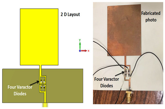 At this stage, the BPF with four varactor diodes was embedded with the monopole antenna to compose the suggested filtenna. Figure 11 illustrates the 2-D layout and the fabricated photo of the filtenna. Four varactor diodes (MGV125-23) with a tuning range from 2.2 to 0.22 pF were utilized when external DC voltage was tuned from 0 to 20 V. The R&S ZVA 67 VNA was used in the testing.