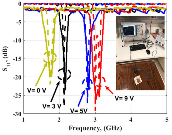 The S11 simulated (dashed) and measured (solid) outcomes of the filtenna at different V.