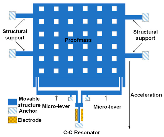 Figure 2. The schematic of our silicon-based MEMS accelerometer. The tune fork resonator is an accelerometer sensor, which is driven and sensed by capacitors. The proof mass has four structural supports and a pair of micro-levers.