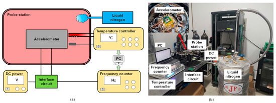 Figure 4. Temperature experiment setup. (a) The schematic of the temperature experiment: The probe station act as a temperature oven heated up by the temperature controller and cooled down by liquid nitrogen. The accelerometer was zero-bias and driven by an interface circuit. The frequency counter monitored the frequency changes. (b) The real picture of the temperature experiment.