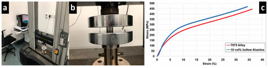 The response for plastic deformation by 7075 matrix is modelled using the JC material model. The JC model depends on the flow stress on the strain, strain rate, and peak cutting temperature. The constants for the JC model are calculated from tests involving stress, strain, and peak cutting temperature. A set of compression tests is conducted on the squeeze casted samples at different strain rates and peak cutting temperatures using the 3400 series of the Instron universal testing machine, which is capable up to 100 kN (as shown in Figure 2a,b), through which material constants are calculated. A stress–strain datum which represents 7075 syntactic foam is shown in Figure 2c. On the basis of mechanical testing conducted at different peak cutting temperatures and strain rates, a quasi-static compression test is used to calculate yield stress (A = 170 MPa) and strain hardening variables (B = 658 MPa and n = 0.53) at reference strain rate (1/s) and peak cutting temperature (20 °C) [11]. The mechanical tests which are conducted at different strain rates at fixed peak cutting temperature are used for determining the dimensionless strain rate sensitivity parameter (C = 0.019). The tests performed for different peak cutting temperatures at a uniform strain rate are also used for calculating the thermal softening coefficient (m = 0.32). The main characteristics of 7075 matrix and alumina bubble (supplier data) are mentioned in Table 2, and the properties of the machining tool material, which are used in AdvantEdgeTM, are mentioned in Table 3.