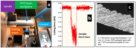 (a) Machining experimental test setup; (b) Sample force graph taken from dynamometer; (c) Representative machined chip for 7075 syntactic foam.