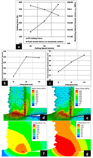 Figure 4a–c reveals the influence of cutting speed on the magnitude of generated cutting force, cutting induced peak tensile stress (measured on the machined surface), peak equivalent plastic strain, and peak cutting temperature under dry cutting. The cutting force decreases in a linear manner from 377 N to 306 N as the cutting speed is increased from 25 m/min to 100 m/min. From the numerical analysis, the machining induced peak tensile stress increases by 38.74% when the cutting speed is increased. The peak equivalent plastic strain in the shear zone increases from 2.78 to 2.95, which is approximately about 6.1%, when the cutting speed is increased. Although the strain is expected to increase, the negligible drop in plastic strain from 50 m/min to 100 m/min could be due to the assumption made in the model. Being one of the few models developed for aluminium based syntactic foams, the plastic strain (also known as equivalent plastic strain) contour values were comparable to Josyula and Narala’s paper, which discusses TiC particle distribution in aluminium based composite using FE [30]. Variation in peak cutting temperature is also observed, with an increase of 50% as the cutting speed is increased from 25 m/min to 100 m/min. Figure 4d,e shows the influence of cutting speed on the variation of Von Mises stress contours. As seen from the contour, a maximum value of 640 MPa is noted at 25 m/min. From Figure 4f,g, the influence of cutting speed on peak cutting temperature contours is shown, with a maximum value of 240 °C at 100 m/min.