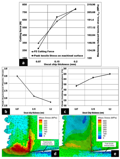 The influence of uncut chip thickness on the cutting force, cutting induced peak tensile stress (measured on the machined surface), peak equivalent plastic strain, and peak cutting temperature in a dry environment are shown in Figure 5a–c. The cutting forces are escalated in a very steep manner from 349 N to 799 N—an approximate increase of 129%—as uncut chip thickness is increased to 0.2 mm. The peak tensile induced stress on the machined surface increases by 53.11% when the uncut chip thickness increases from 0.07 mm to 0.2 mm. Moreover, the peak equivalent plastic strain drops from 2.95 to 2.6 at 0.2 mm. Additionally, peak cutting temperatures are found to increase with an increment in uncut chip thickness from 0.07 mm to 0.2 mm with an observed maximum peak cutting temperature of 220 °C (refer to Figure 5c). Figure 5d,e displays the Von Mises stress contour with the peak stress varying from 490 MPa to 560 MPa as the uncut chip thickness rises from 0.07 mm to 0.2 mm. The same figures also show the peak tensile induced stress located at the machined surface, which is highlighted by the blue contours.