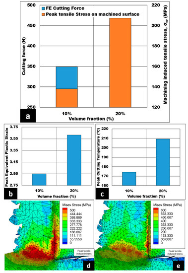 (a–c) Effect of volume fraction of alumina bubble present in 7075 on cutting forces, machining induced stress on machined surface, peak equivalent plastic strain, and peak cutting temperature (AdvantEdgeTM simulation) (h = 0.07 mm, Vc = 50 m/min, b = 3 mm) under dry conditions; Von Mises stress contour at (d) 10% and (e) 20%.