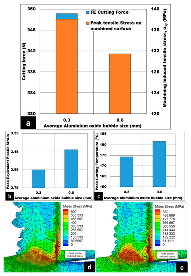 Figure 7a–c show the effect of the average size of hollow aluminium oxide bubbles on the magnitude cutting forces generated, cutting induced peak tensile stress (measured on the machined surface), peak equivalent plastic strain, and peak cutting temperature under dry conditions. The cutting forces decline from 349 N to 336 N as the average size of hollow aluminium oxide bubbles becomes coarser. Moreover, cutting induced peak tensile stress declines by 4.8% when the average size of hollow aluminium oxide bubbles is increased. In addition, the peak equivalent plastic strain is observed to rise from 2.95 to 3.18, an increase of around 7.79%. Lastly, peak cutting temperature increases from 174 °C to 182 °C with coarser bubble size. Von Mises stress contours for the average size of hollow aluminium oxide bubbles are shown in Figure 7d,e. As shown by the figures, when the average size of hollow aluminium oxide bubbles becomes coarser, the peak Von Mises stress value drops from 600 MPa to 550 MPa, a roughly 8.33% reduction. In addition, the same figures also reveal the peak tensile induced stress located at the machined surface, as pointed out by the dark blue color.