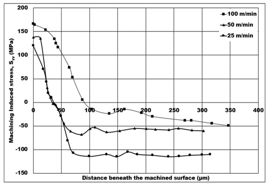 - An increase in cutting speed from 25 m/min to 100 m/min caused the machining induced surface to be more tensile in nature at higher cutting speeds up to a depth of 90 microns because of thermal softening of the matrix (as shown through peak cutting temperature contours).