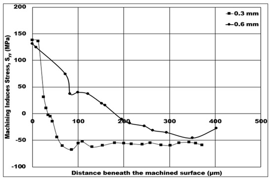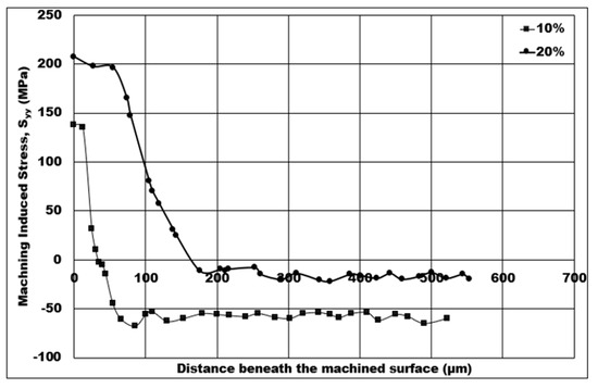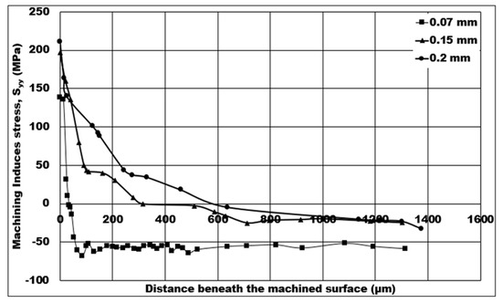 Mechanical stresses induced on the machined surface and sub-surface by the machining process can be detrimental to the component’s fatigue life in service. Therefore, it is vital to investigate and analyze the behavior of machining induced stress. In this study, the influence of machining conditions on the simulated machining induced stress is estimated using a 2D FE simulation, and analysis of the stress distribution is also conducted. The fatigue life of components will rely heavily on the depth of machining induced tensile stress. Because certain machining conditions create non-favorable tensile induced machining stress, one of the aims of this paper is to discover the influence of machining conditions on the depth of tensile induced stress distribution. In Figure 8, Figure 9, Figure 10, Figure 11 and Figure 12, tensile stress is initially distributed on below the machined surface, and, after a certain distance, distribution is later changed to compressive stress.