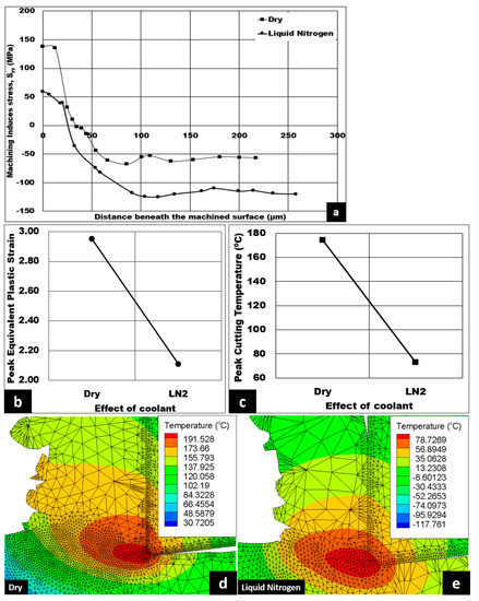 (a) Numerical machining induced stress distribution, and variation of (b) peak equivalent plastic strain and (c) peak cutting temperature under the influence of coolant (10% volume fraction, cutting speed = 50 m/min, uncut chip thickness = 0.07 mm, average size = 0.3 mm, volume fraction 10%); Corresponding temperature contours at (d) dry and (e) liquid nitrogen conditions respectively.