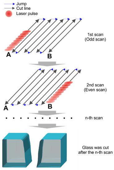 Laser cutting was realized with a galvanometer scanner IntelliSCANde14 from ScanLab by scanning parallel cut lines separated by hatch distance (see Figure 1). Each cut line was scanned once per scan. After a fixed number of lines, the hatch and the laser beam scanning directions were changed to the opposite. A positive hatch and scanning direction (A to B) were used for odd scans. A negative hatch with the opposite scanning direction (B to A) was used for even scans. The aforementioned number of cut lines and the hatch distance defined the width of the cut. Scans were repeated multiple times until the glass plate was cut through completely.