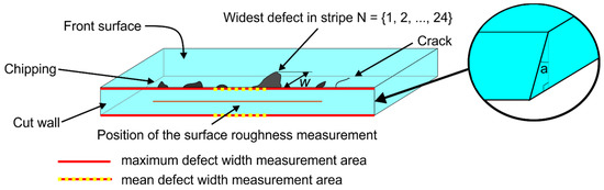 Next, we evaluated cut-edge defects at the front and back sides of laser-cut glass strips. Chipping or crack formation from the cut edge were considered defects. The mean defect width wmean was evaluated by calculating the average width of every chipping and cracking at the cut edge measured over a distance of 1.5 mm. The measurement area was positioned at the center of the laser cut. The maximum defect width wmax was identified as the widest defect per single cut edge along the entire length of the laser cut. The width of defects w was measured normal to the glass surface, as shown in Figure 3. Each strip consisted of four cutting edges (two at the front and two at the back). All laser-cut strips were measured for wmean, wmax, and cut-sidewall roughness Ra. Values obtained from strips cut under the same cutting parameters were averaged. Cut-edge quality was evaluated separately for the front and back sides.