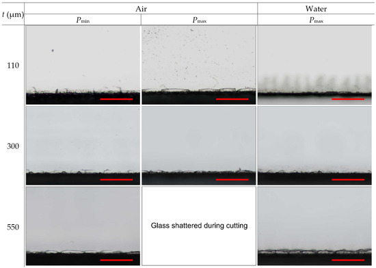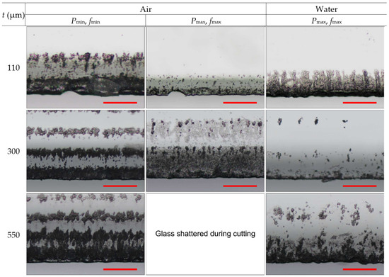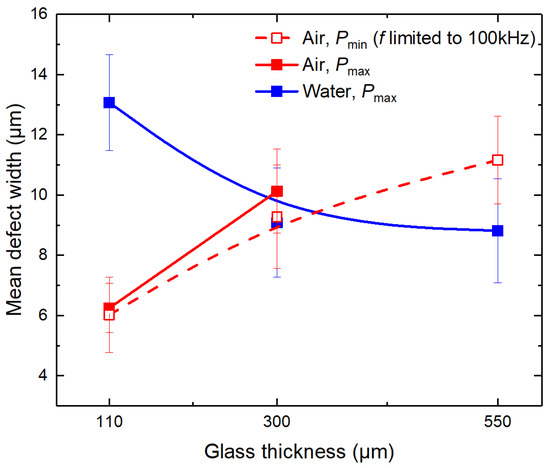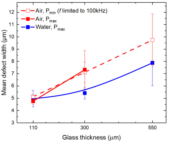 At t = 110 μm, the mean defect width was almost identical between the different cutting regimes with the average mean defect value of 4.95 ± 0.2 μm (ambient air at Pmax and Pmin, and water). However, the mean defect width at higher glass thicknesses was narrower in water: at t = 300 μm it was 25% lower (5.4 ± 0.5 μm versus 7.2 ± 1.2 μm) and 19% lower at t = 550 μm (7.9 ± 1.9 μm versus 9.8 ± 2.1 μm) than in cuts produced in ambient air.