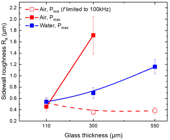 Cut-sidewall roughness Ra’s dependency on the glass thickness is presented in Figure 8. According to the results, the sidewall roughness was almost identical at t = 110 µm for glass strips cut in ambient air (at Pmin and Pmax) and water (at Pmax), with an average value of 0.5 ± 0.04 µm.